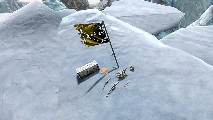 Похоже, так выглядит Соратник, попавший из Атморы на север Скайрима. Шучу, но должно же быть логичное обоснование поступку этого неизвестного искателя приключений. Он поставил флаг, почитал редкую книгу «Рыцари Девяти» (учебник навыка тяжелой брони), лег и умер рядом с сундуком.