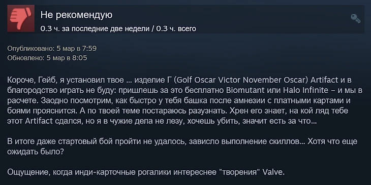 Valve официально забросила Artifact – оригинальная версия и Artifact 2.0 (переименованный в Artifact Foundry) стали бесплатными. Foundry не выйдет из беты из-за нехватки активных игроков. По данным SteamDB еще неделю назад в него играли 30 человек за весь день, а на Twitch никто не стримил и не смотрел.