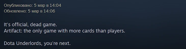 «Игра официально умерла. Artifact – единственная игра, в которой карт больше, чем игроков. Dota Underlords, ты следующая».