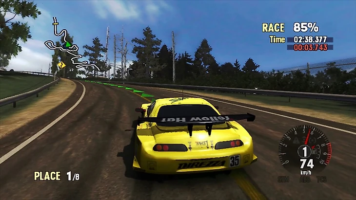 Игра рисовала понятную траекторию прямо на асфальте – когда полоска горит зеленым, игрок ускоряется, а на поворотах полоска становилась желтой и красной, чтобы геймеры догадывались сбросить скорость. Таким образом, даже новичок быстро разбирался в управлении. Траектория менялась в зависимости от машины: из-за разницы в управляемости некоторые машины требовали сбросить скорость задолго до поворота, чтобы не вылететь с дороги.