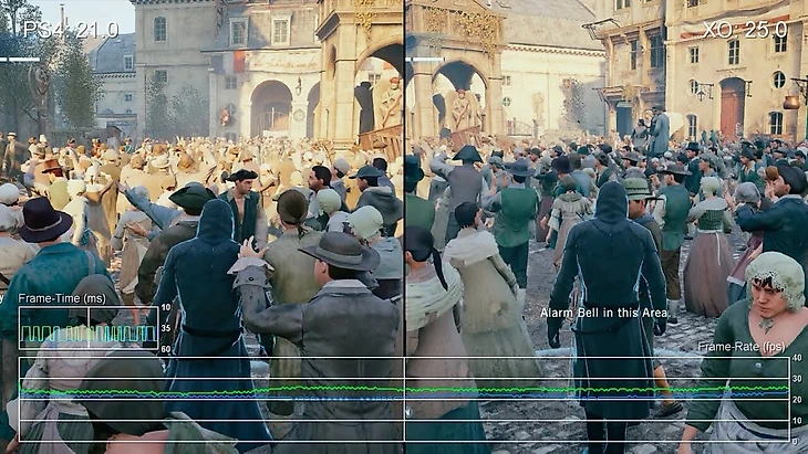 Незадолго до релиза выяснилось, что игра будет работать в 900p (вместо полноценного Full HD) при 30 FPS как на PS4, так и на Xbox One – геймеры надеялись на 60 FPS. Ubisoft же заявила, что вдвое меньшее количество кадров в секунду ощущается «более кинематографичным», якобы в этом причина ограничения. Но Unity на релизе не выдержала и эту планку: производительность на консолях часто проседала до 20 FPS.