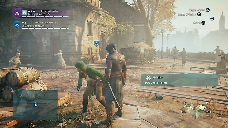 Подзаголовком не зря выбрали «Единство» – помимо исторического революционно подтекста он отсылал к новому кооперативному режим до четырех игроков. Совместно можно проходить 18 специальных заданий. Они не слишком хорошо продуманы, из-за чего походы со случайными игроками часто превращаются в мучение: ассасины-товарищи теряются, путаются в задачах, намеренно или случайно и саботируют, а иногда в происходящее вмешиваются лаги.