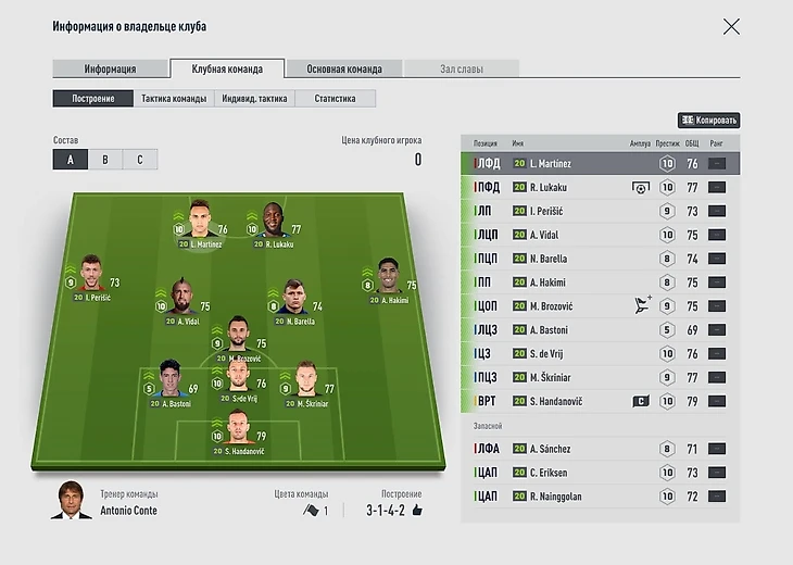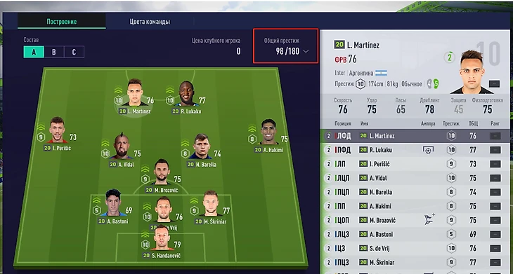 А «почти», потому что одно ограничение все же есть – Престиж. У каждого игрока помимо общего рейтинга есть еще и уровень Престижа – чем выше общий параметр, тем выше и Престиж. К примеру, Престиж Лукаку с общим рейтингом 77 – 10, а у Коларова с общим рейтингом 70 – 8. В текущей версии игры общий Престиж игроков состава не должен превышать 180.
