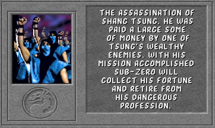 Сразу важное уточнение – хотя игрок может выбрать любого бойца и стать чемпионом турнира, каноничным победителем во всех MK стал Лю Кан, поэтому описание концовок за других бойцов немного отличается от того, что происходит в следующих частях. Почему это важно? Потому, что Саб-Зиро в своей концовке в MK 1 убивает Шан Цзуна по наводке богатых нанимателей и уходит из преступной жизни с огромным состоянием на руках, что в корне не соответствует канону.