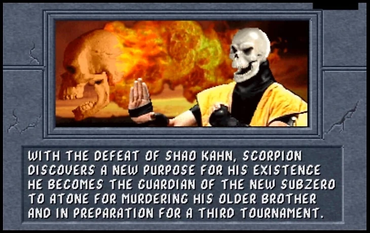 Младший Саб-Зиро же на турнире оказался не просто так – его послало руководство Лин Куэй для убийства Шан Цзуна (это было заданием Би-Хана) и чтобы узнать новости о старшем брате, но он возвращается в клан ни с чем. По сути, в финале второго MK заканчивается и противостояние Скорпиона и Саб-Зиро – в MK 3 продолжится история Куай Ляна, а вот Скорпиона добавят только в Ultimate-издании, как воина армии Шао Кана.