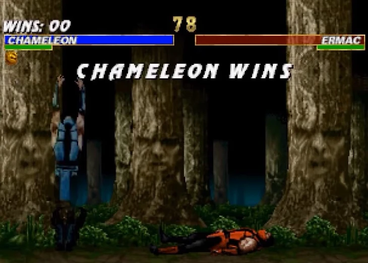 Хамелеон – первый провал среди секретных персонажей MK. Фишка Хамелеона в том, что он копирует приемы других ниндзя, и у него нет своей истории. Механика копирования работает так – персонаж рандомно выбирает одного из ниндзя перед началом матча, а затем меняет приемы каждые десять секунд.