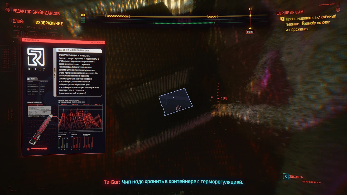 В первом брейндансе разобраться несложно – действий мало, дорожек всего две. Когда на верхних полосах будут появляться жирные отрезки, поставьте брейнданс на паузу и перейдите в режим осмотра, чтобы найти нужную вещь. По тому же принципу работает нижняя полоска со звуком.