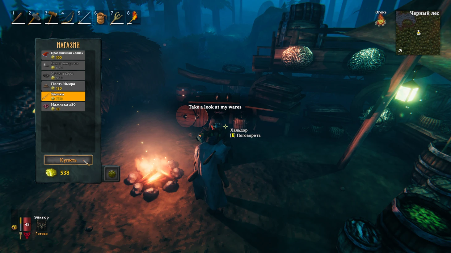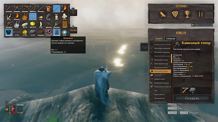 Рыбалка – отличный способ добыть еду в Valheim на любой стадии игры. Смастерить удочку у вас не получится – она продается только у торговца за 350 монет. Также вам понадобится наживка для ловли рыбы.