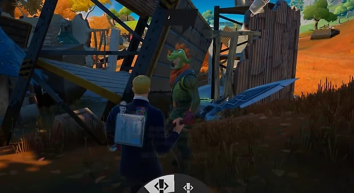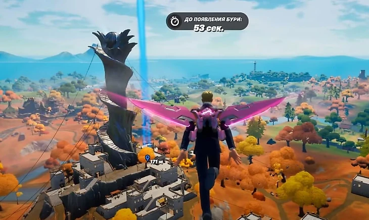 Башня – центральная локация нового сезона Fortnite. Вокруг территории разбросаны золотые фигурки. Все нужные нам предметы подсвечены синим цветом. Всего три фигурки. Две расположены в доме справа от центра локации – одна на втором этаже, вторая на третьем. А третья фигурка спрятана в забитом досками ущелье.