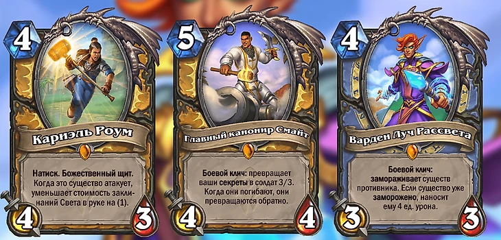 Во-первых, претензии к силе легендарных карт Паладина. Blizzard вернула неплохую синергию секретам, и на пятый ход разыгрывание «Канонира» перехватит темп или задавит соперника – по уровню бесячести эта карта наверняка переплюнет «Загадочного претендента». Кариэль – натиск с божественным щитом, что делает ее лучше «Неуловимого змея». Плюс у нее есть полезный эффект. А у Вардена неплохая синергия с «Конусом холода» и новой картой «Шквал» (напоминаю, что «Кольцо льда» уходит в вольный), и это будет отличной очисткой для Мага на заморозке.
