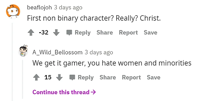 – «Первый небинарный персонаж»? Серьезно? Боже.– Мы поняли, геймер, ты ненавидишь женщин и меньшинства.
