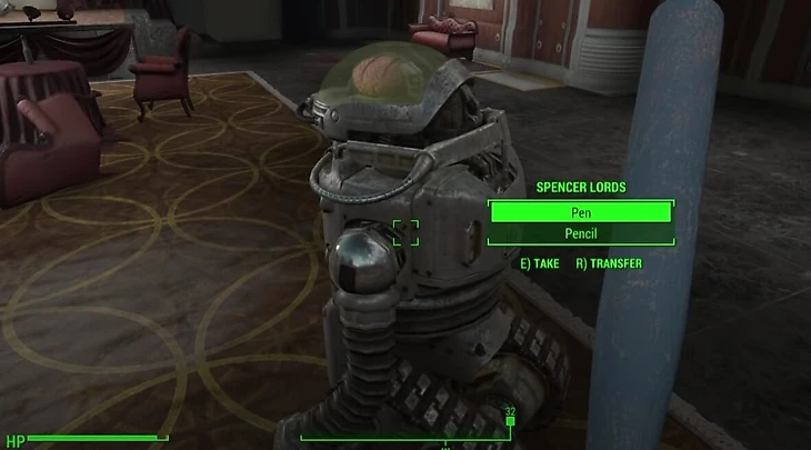 Возможно, сама Bethesda не смогла реализовать такой многоуровневый детектив, из-за чего и отказалась от дополнительного персонажа. По внешнему виду Спенсера можно сказать, что от него избавились на раннем этапе – в отличие от других роботов в убежище, у него нет отличительной детали. Берт Риггс ходит с галстуком-бабочкой, Сантьяго перепачкан краской, вокруг головы Кита повязан платок, а Спенсер выглядит как обычный робомозг. Можно пофантазировать, что карандаш и ручка в инвентаре делают его писателем, но, как и другие вырезанные NPC, робот не говорит с нами, так что деталей о его происхождении у нас нет.