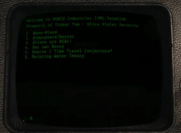 Вот только в самой Подземке о настоящем прошлом Дьякона идут споры. Робот ПАМ в своем терминале пишет, что Дьякон носил прозвище Джон Д и был в руководстве фракции уже давно, но его отстранили за постоянную ложь. Техник Том в своем дневнике утверждает, что Дьякон – пришелец из будущего.