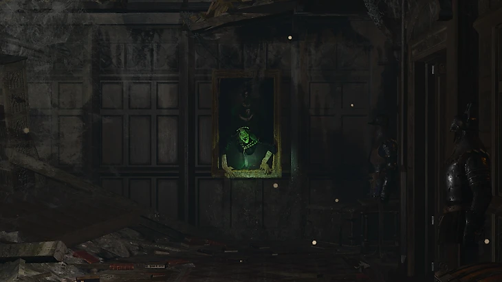 После расправы над Ключником Геральт заходит в поместье и попадает в ловушку заскриптованных скримеров – что-то падает, грохочет и ломается, а из картины вылезает призрак Ирис. Именно призрак девушки устраивает все спецэффекты в доме, чтобы никому не пришло в голову его ограбить. Ирис очень ценит свое одиночество.