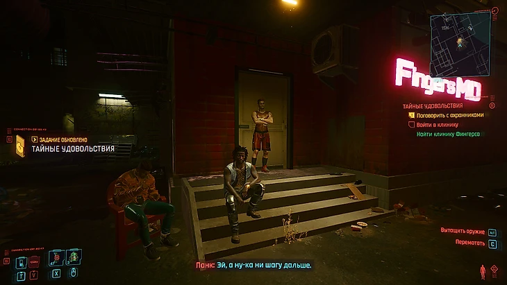 Ви отправится на Чпок-стрит в поисках Фингерса. Можно позвонить Джуди и рассказать, что Дубман тоже не знает, что с Эвелин. Она обрадуется, что Ви держит слово. На входе в клинику Фингерса сидят три вышибалы. Можете договориться с ними словами, 7 Силы или предысторией.