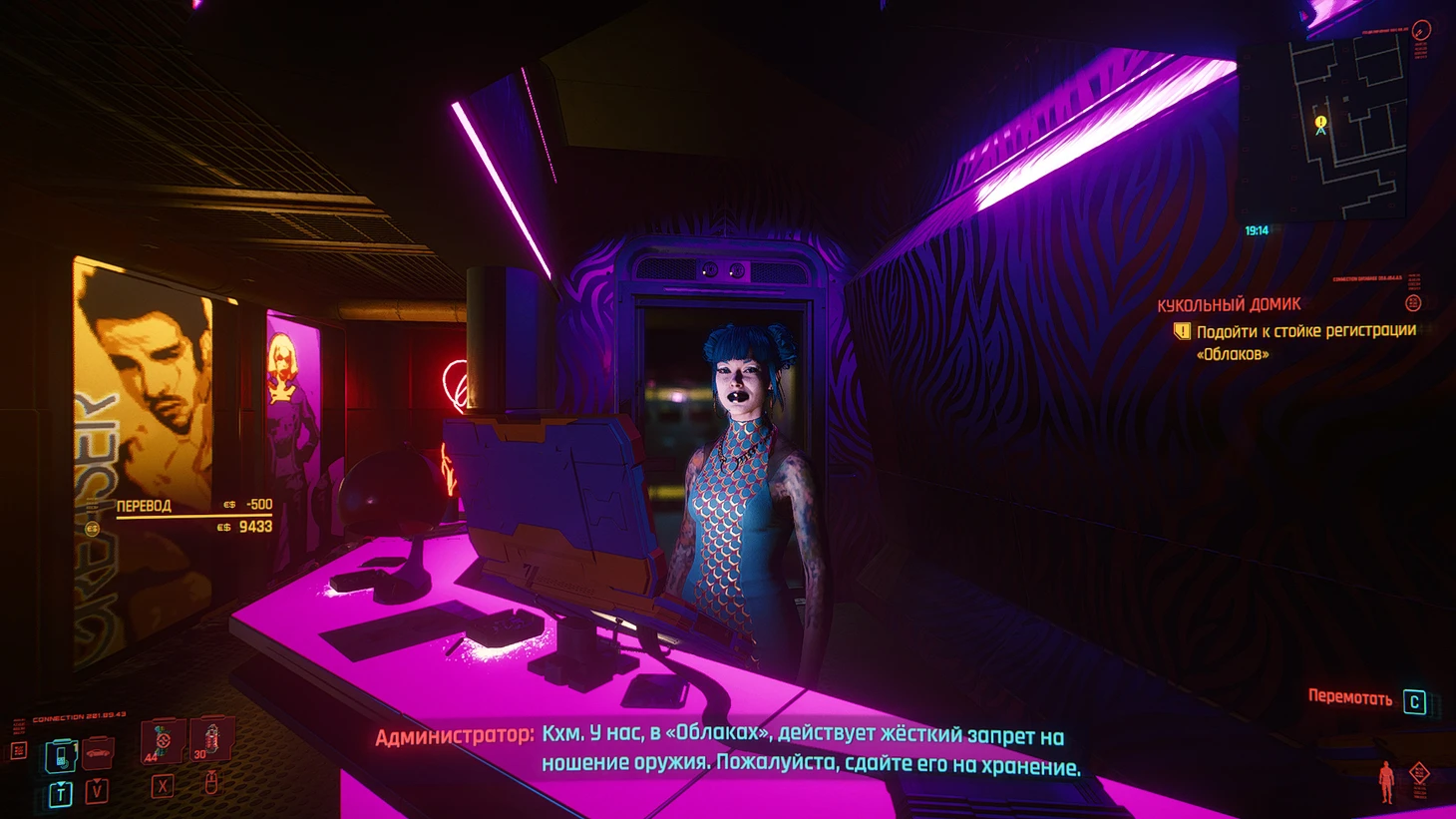В «Облаках» вам предложат выбрать куклу и заплатить 500 долларов. Выбирайте: Ангел это кукла-мужчина, Скай – девушка. На самом деле, их диалоги почти не отличаются, так что выбор ни на что не повлияет. Сдавайте оружие и входите в выбранную кабинку.