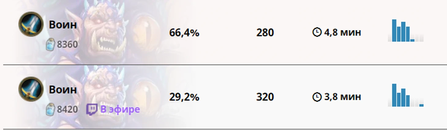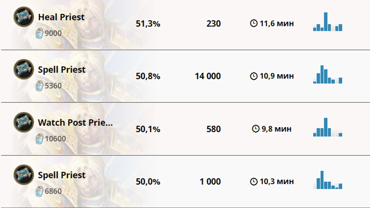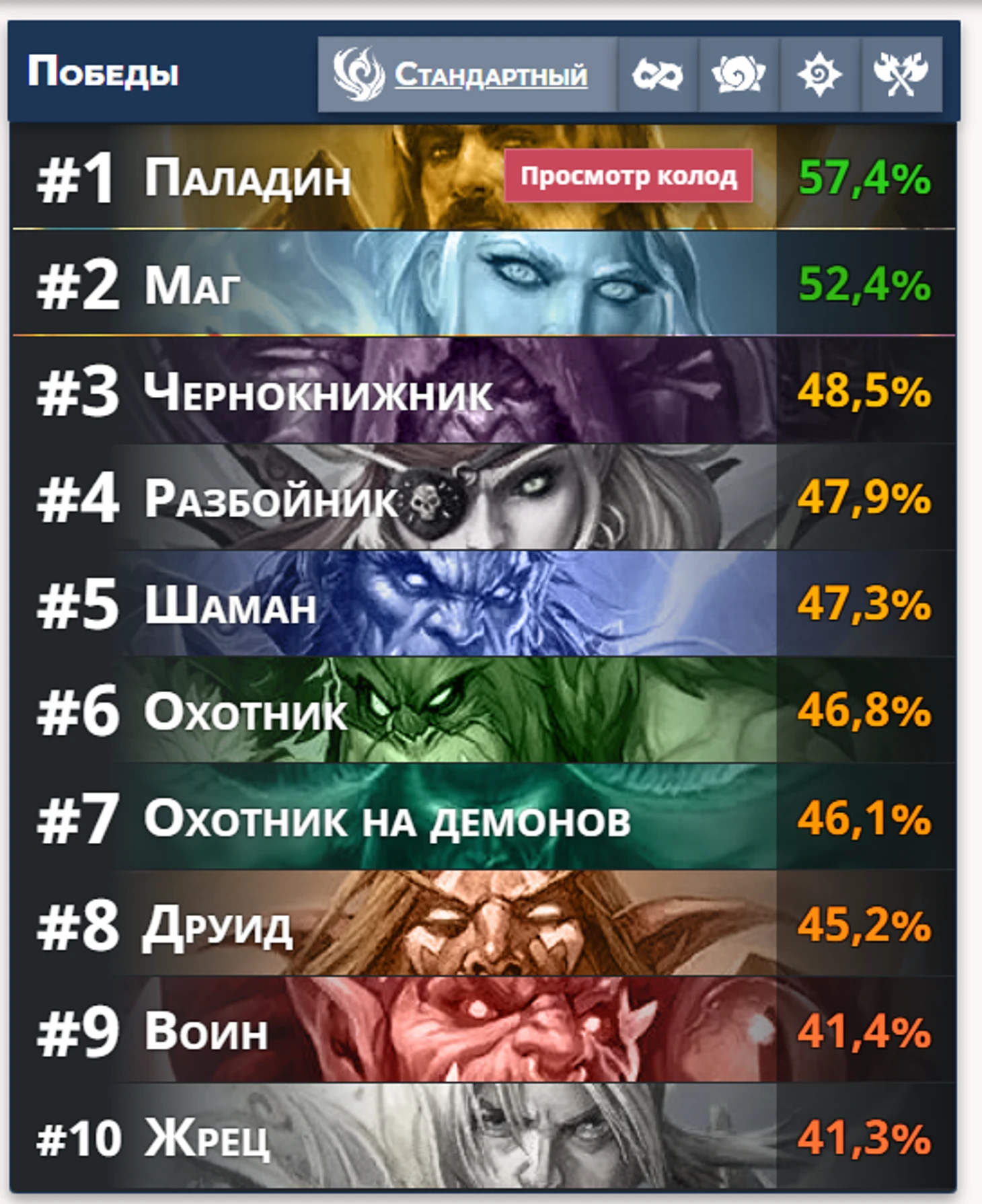 Ничего катастрофичного с Воином и Жрецом не произошло – у них есть нормальные колоды, но у HSreplay считается среднее число для винрейта, поэтому они в самом подвале таблицы.