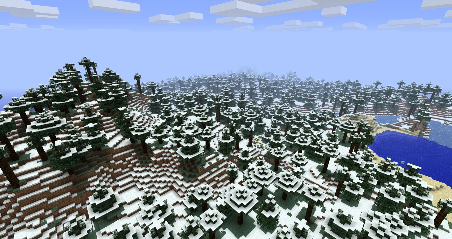 В холодных биомах на высоте (больше 256 блоков) идет снег. Ниже – дождь. В данном биоме растительность имеет синеватый оттенок. Как правило, здесь преобладают горы или тайга.
