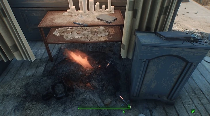 В одном из домов лежит куча пепла, в которой торчит меч китайского офицера – довольно стандартное оружие ближнего боя, продается у многих торговцев. Но при взаимодействии с ним, из пепла вспыхивает огонь, а сверху падают стимуляторы. Не хватает только надписи «костер зажжен», неправда ли?