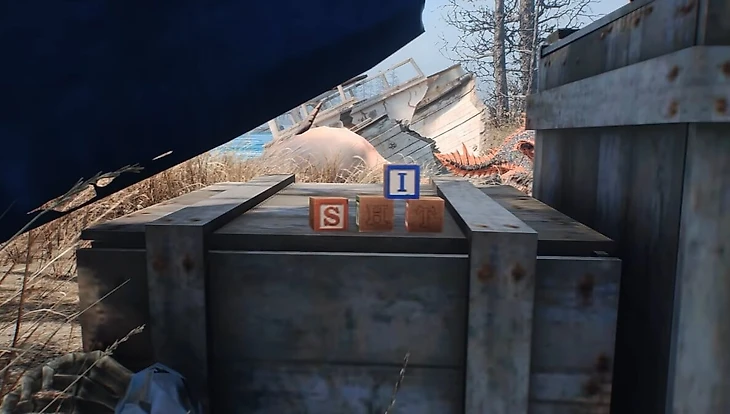 Попасть туда честным путем никак не получается, а вот с помощью консольной команды можно преодолеть невидимую стену. Визуально здесь выделяется только один остров – с синей палаткой и разбитой лодкой рядом. Но вместо истории о несчастных выживших, вас ждет лишь слово «shit», собранное из кубиков.