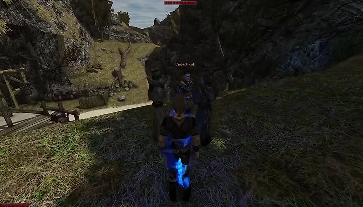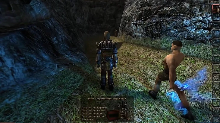 Видите этих ребят, что кинули вас в тюрягу? Парень в доспехах – королевский стражник. В него можно вселиться клавишей O, зайти в инвентарь, выкинуть броню, вселиться обратно в себя и забрать одежду. Требований по силе нет, так что можете сразу надевать.