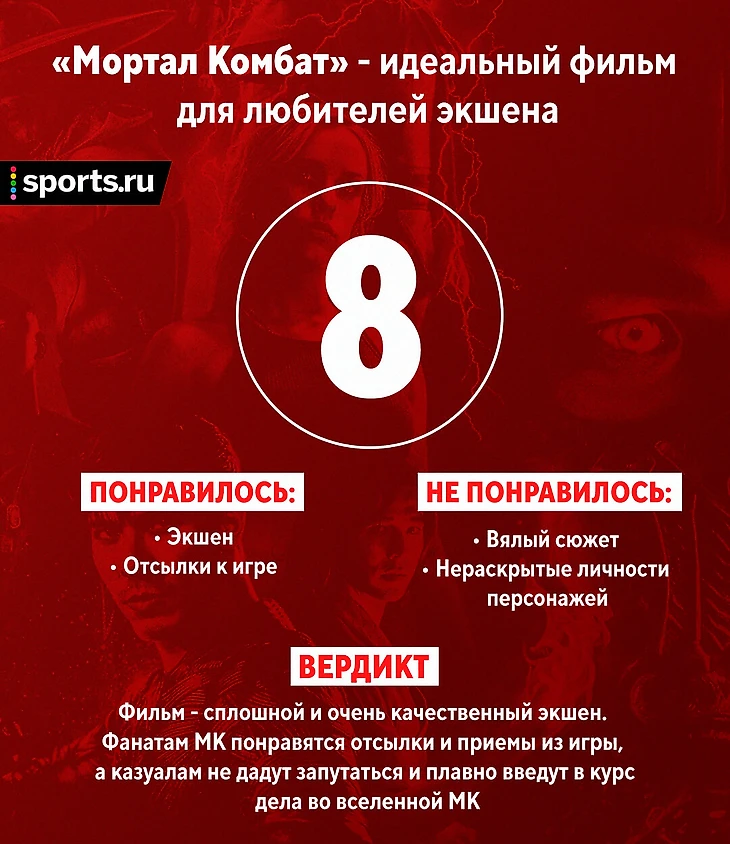 Если вы фанат серии Mortal Kombat, то после просмотра новой экранизации узнаете новые детали о персонажах и кайфанете от отсылок. Если понятия не имеете о способностях героев, но хотите отдохнуть вечером, то вам понравится качественная графика, незамысловатый сюжет и красивый экшен.