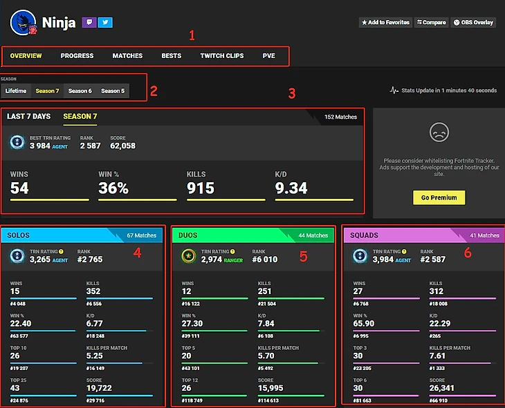 Здесь можно переключаться между статистикой игрока (Overview), прогрессом по сезонам (Progress), историей матчей (Matches). Вкладка Bests покажет игры, в которых игрок убил больше всего противников (за все время существования аккаунта) и самые долгие серии убийств без смерти. В Twitch Clips можно посмотреть клипы с Twitch-канала, если он подключен, а вкладка PVE покажет статистику в режиме против зомби.