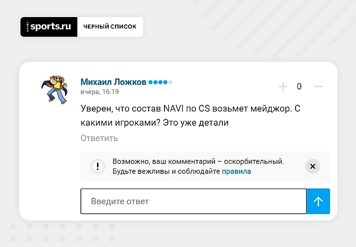 Помимо черных списков, мы добавили новую проверку содержимого при отправке комментариев – нейросетевая модель учится на комментариях, в которых ранее были обнаружены нарушения, и в случае достаточно высокой вероятности нарушения сообщает об этом пользователю. Мы рассчитываем, что комментарии Sports.ru будут местом для конструктивных обсуждений без перехода на личности.