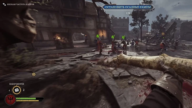 Интерактивность окружения в Chivalry 2 радует. Взаимодействовать можно с множеством элементов карты – от бревен до куриц. Все подбирается и бросается, а чем-то даже можно подраться. То же самое с оружием побежденного врага или союзника – если вам надоел ваш одноручный топор, а рядом с вами погиб товарищ с двуручным мечом – берите, не стесняйтесь. Если вы играете лучником, то не обязательно до конца матча стрелять – никто не запрещает брать любое другое оружие с убитых врагов / союзников.