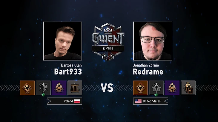 Гвинтеры начали с колод Нильфгаарда и Синдиката. Redrame не боится и усиливает морскую гиену более, чем на 20 очков. Трюк срабатывает: на трех картах Bart933 пасует и теряет карту. Удивительно, но из-за давления американца во втором раунде он возвращает равенство! Шансы к третьему раунду оказываются примерно равны: со счетом 22:24 побеждает Redrame. (0:1)