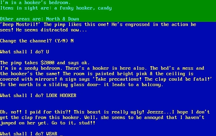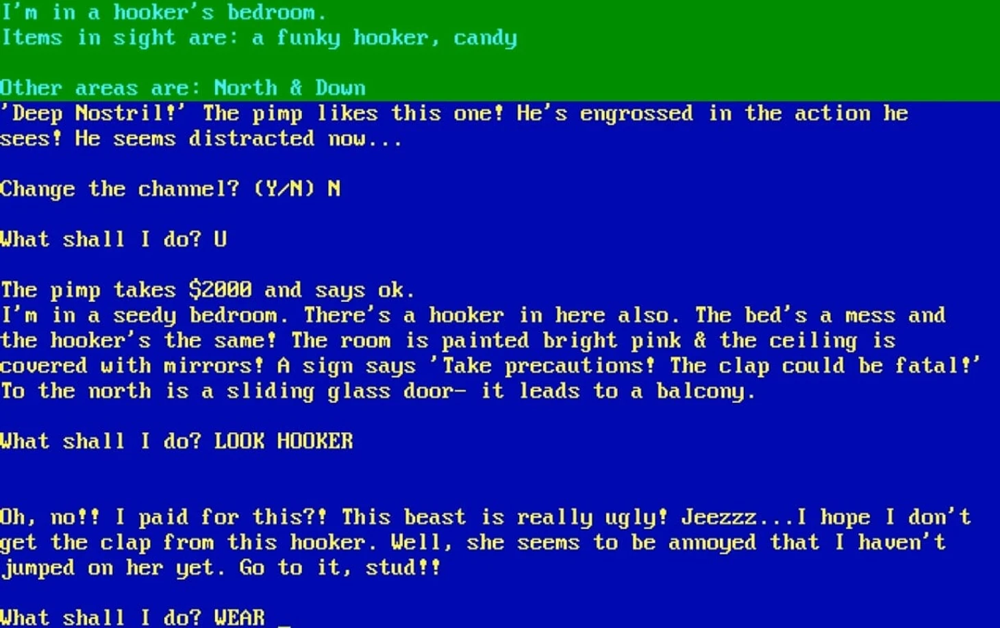 Никаких картинок, или хотя бы пиксельной эротики – только текст. Самая откровенная вещь в игре – ее обложка. Кстати, справа на ней – сооснователь Sierra Entertainment Роберта Уильямс.