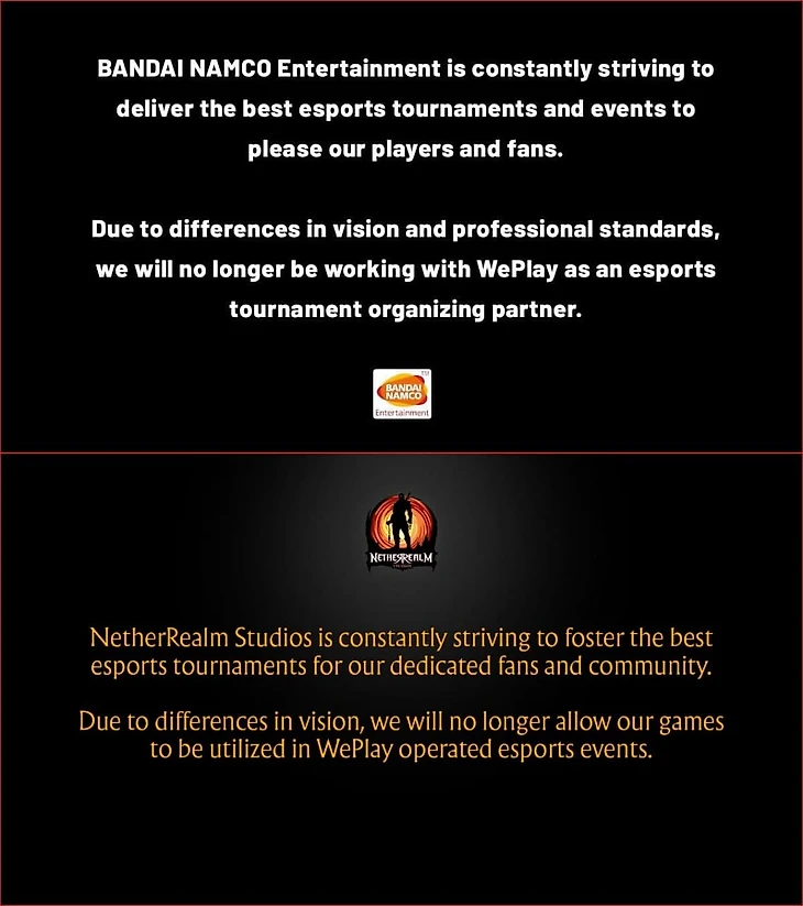 Студии NetherRealm и Bandai Namco, создатели Mortal Kombat 11, Soulcalibur VI и Tekken 7, отказались сотрудничать с киберспортивным холдингом WePlay Esports «из-за разницы во взглядах и профессиональных стандартах».
