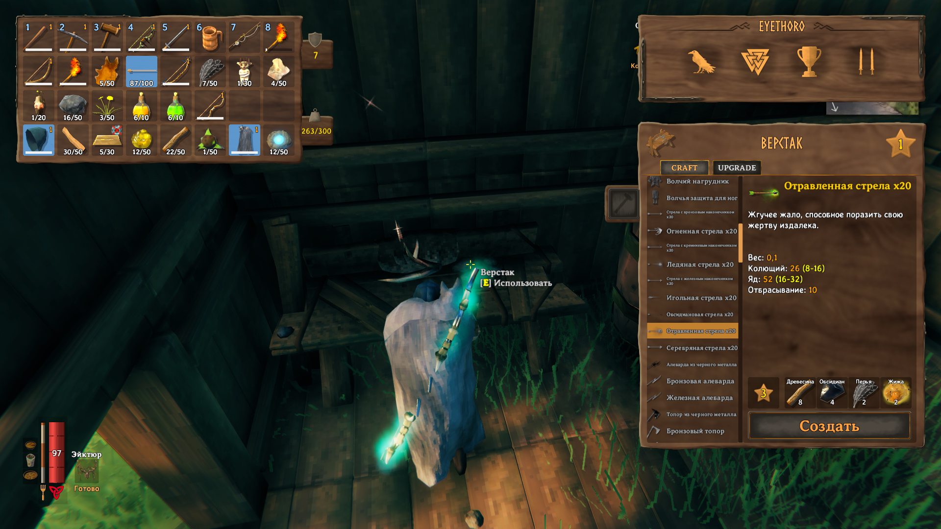 Ресурсы для отравленных стрел добыть немного легче. Для крафта отравленных стрел необходимо добыть немного жижи на Болотах и обсидиана в Горах. Кроме этого, понадобится 2 пера и 8 единиц древесины.