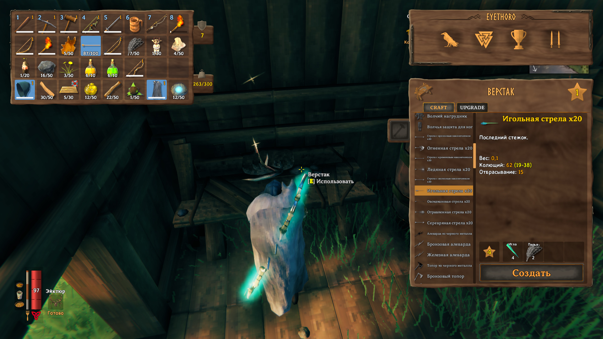 В игре доступно несколько видов стрел. Самые лучшие из них – ледяные и отравленные. Если скрафтить их не получается, на поздних стадиях игры вам подойдут Игольные стрелы. Для крафта 20 стрел вам потребуется 4 иглы и 2 пера.