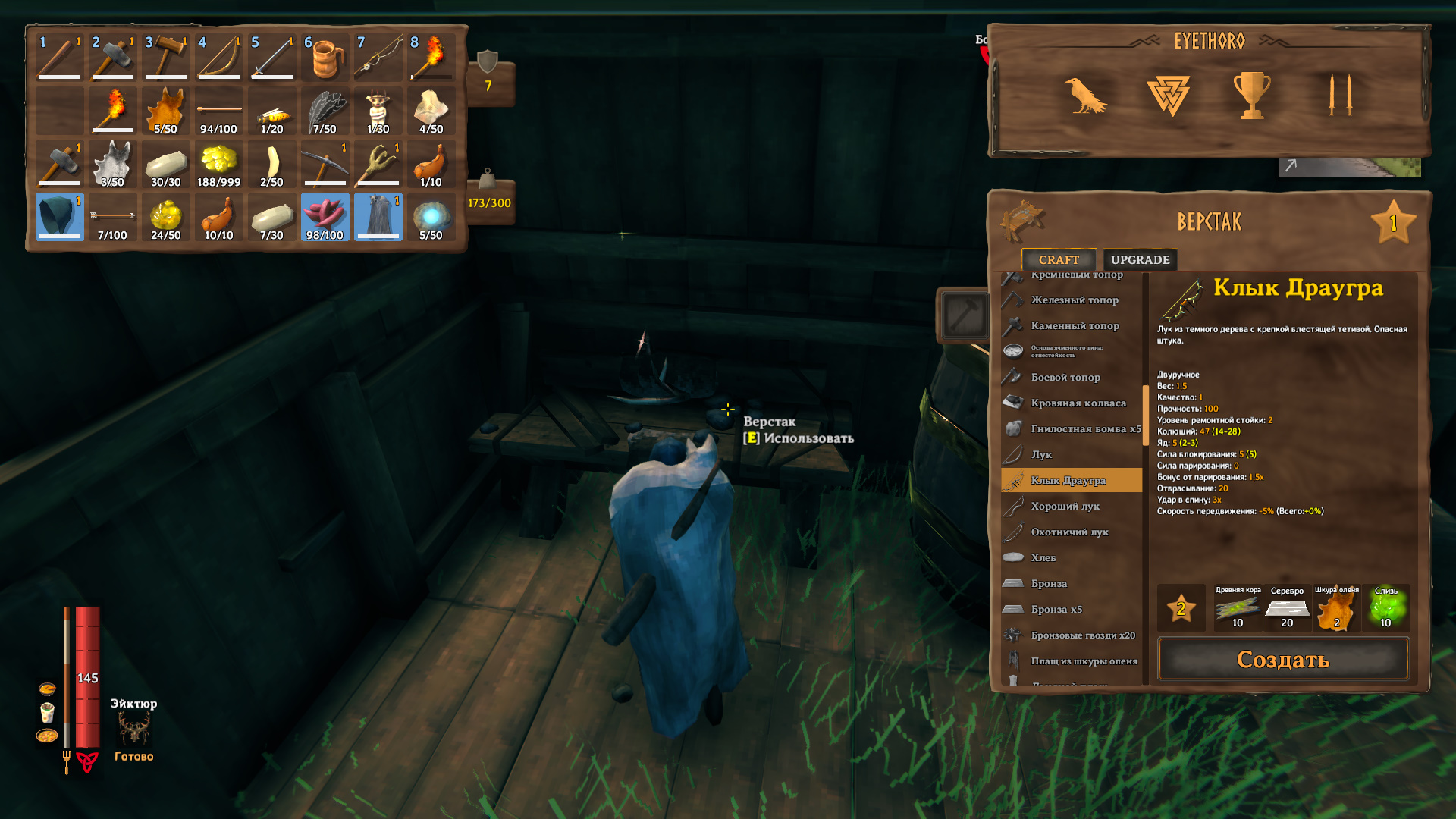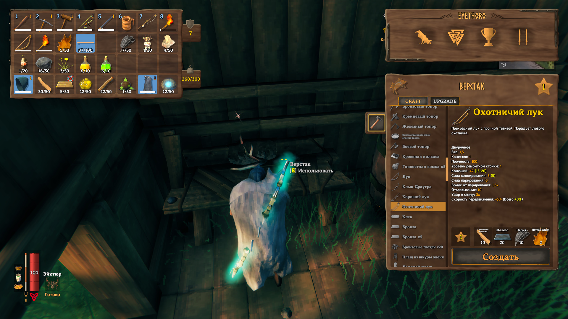 Охотничий лук является вторым по характеристикам луком в Valheim после Клыка Драугра. Он немного слабее, однако все равно обладает неплохим уроном – 42 единицы. Для крафта потребуется 10 единиц качественной древесины, 20 единиц железа, 10 перьев и 2 шкуры оленя.