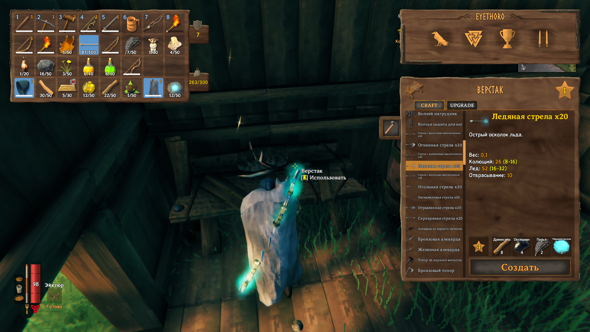 Ледяные стрелы лучше всего использовать с боссами , уязвимыми к холоду. Для крафта 20 стрел вам потребуется 8 единиц древесины, 4 обсидиана, 2 пера и 1 морозная железа.