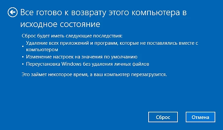 После того, как вы разобрались с сохранением или удалением личных файлов, можно приступать к сбросу Виндовс до заводских настроек. Нажмите кнопку «Сброс» на следующем экране: