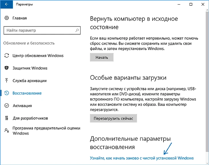 В разделе Восстановление кликните на ссылку «Узнайте, как начать заново с чистой установки Windows»