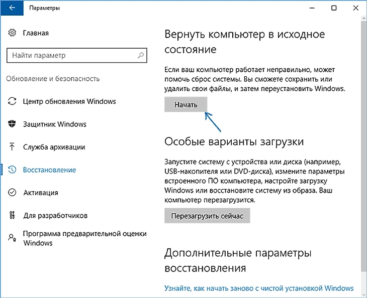 И нажмите на кнопку начать под заголовком «Вернуть компьютер в исходное состояние»