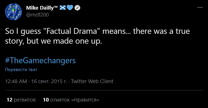 «Так, я думаю, «документальная драма» значит, что «это была правдивая история, но мы ее приукрасили».
