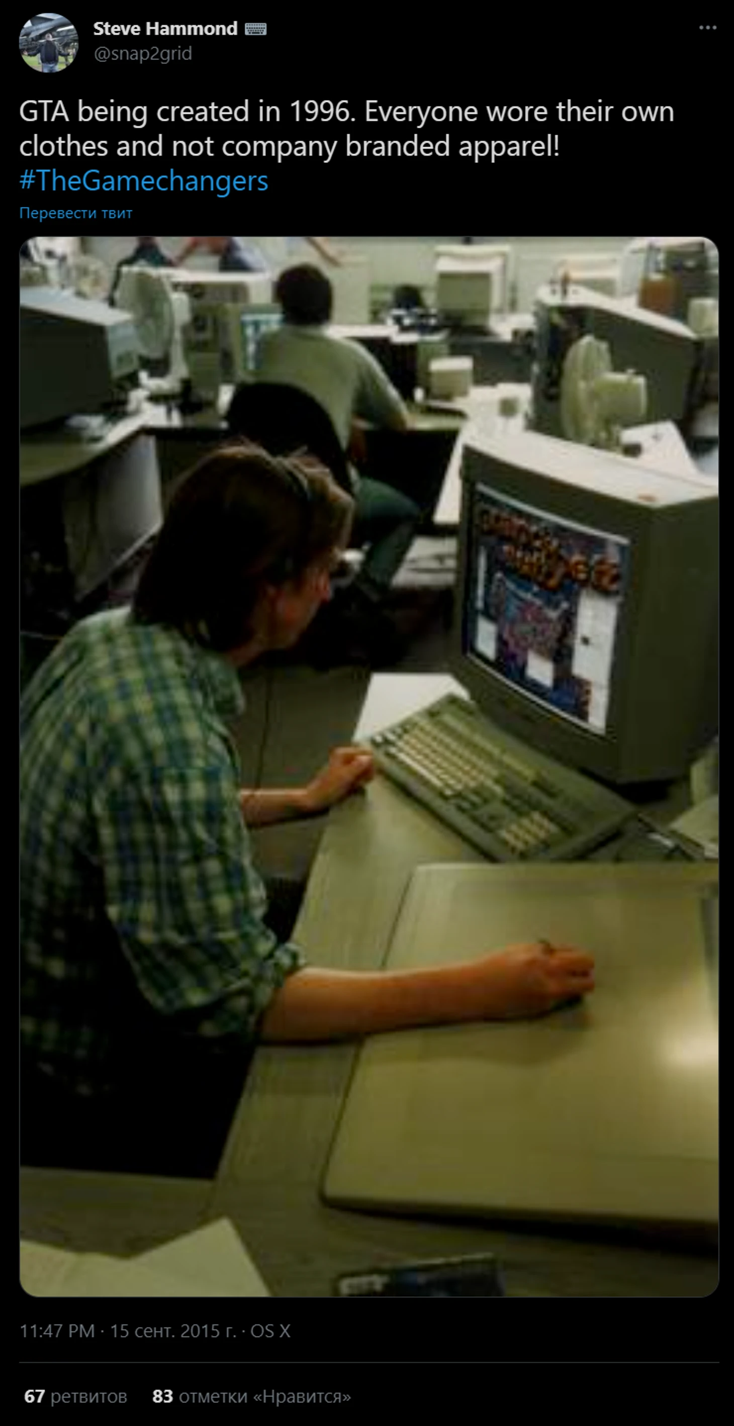 Еще один сотрудник DMA Design Стив Хаммонд поделился фоткой с рабочего места в обычной одежде – в фильме сотрудники носили мерч студии.