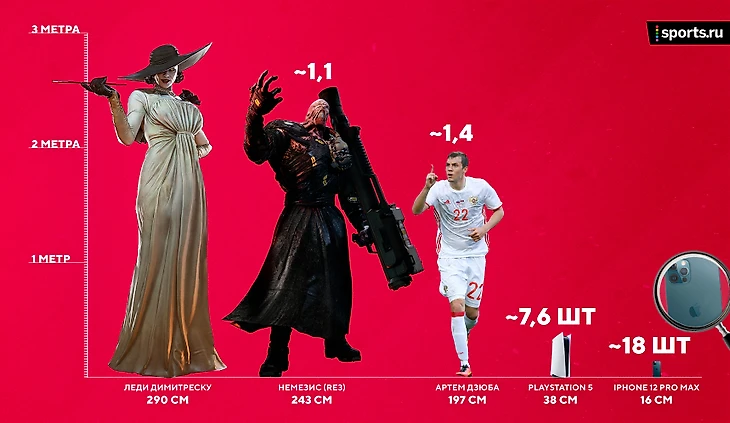Во сколько раз Леди Димитреску ниже Кинг Конга? А во сколько раз выше Дзюбы? Простая инфографика