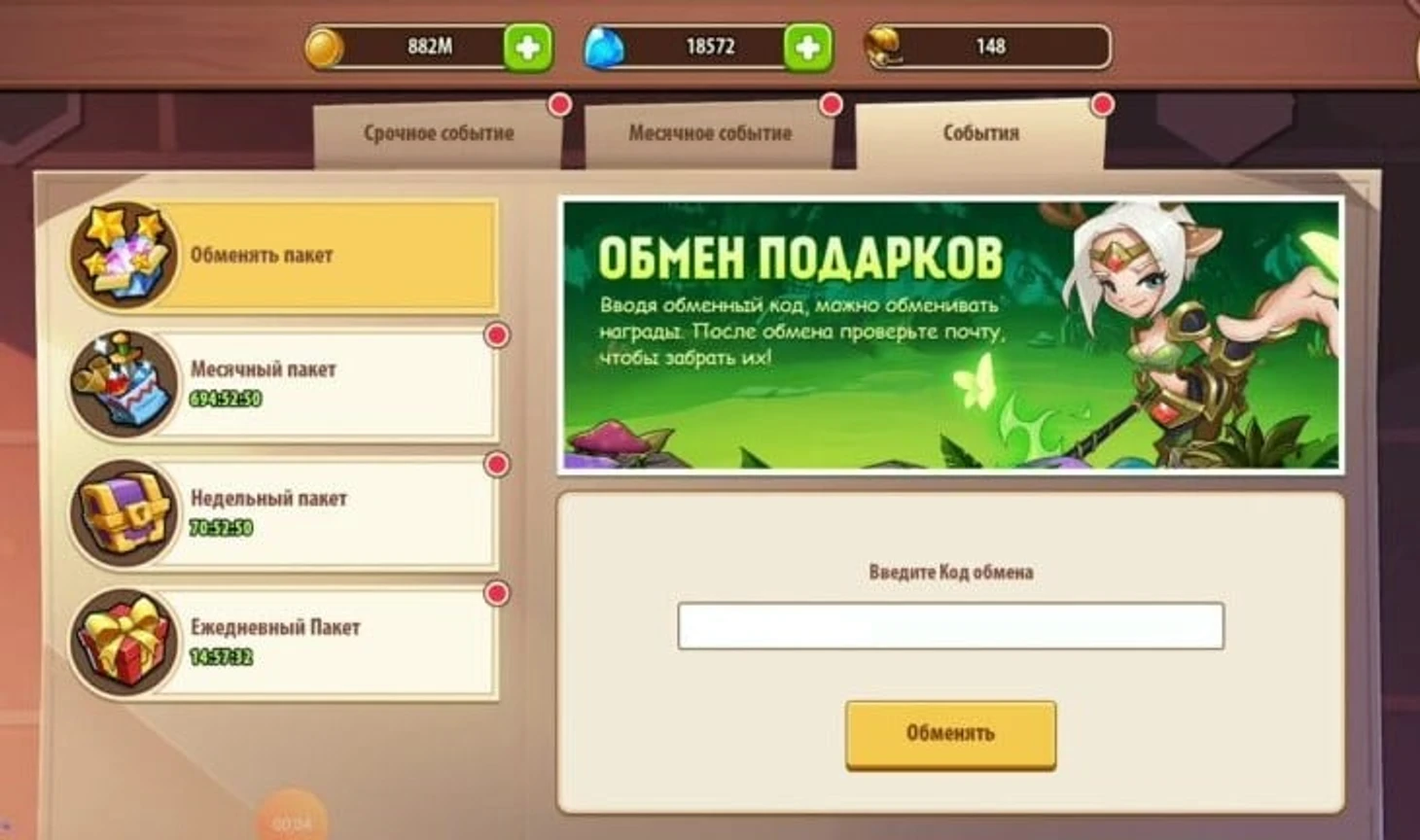 Для ввода кода нужно зайти в раздел «События», выбрать вкладку «Код обмена» и, собственно, ввести код Idle Heroes.