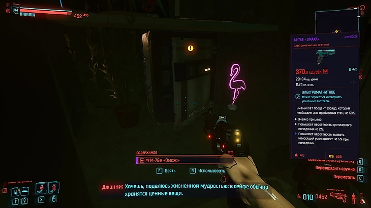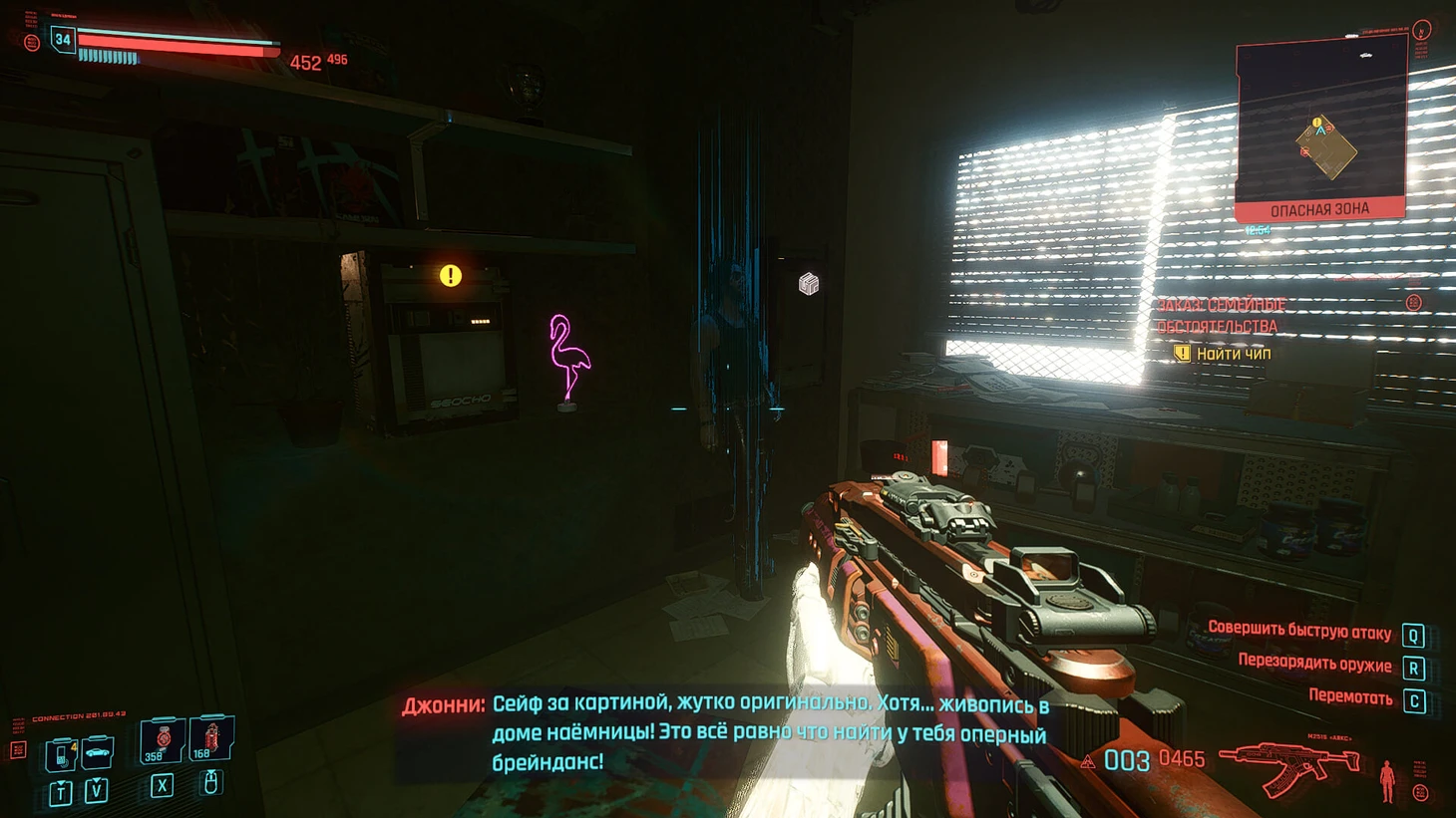 В подвале вас будет ждать драка с киберпсихопаткой. У нее на теле ключ от сейфа, поэтому избежать боя не получится. Там же вы найдете тело ее сестры – вот такая семейная драма. Возвращайтесь и возьмите из сейфа электромагнитный пистолет.