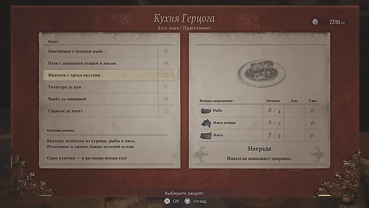 Что еще нужно знать? Мясо занимает место в инвентаре, а кухня Герцога откроется не сразу – сначала нужно победить босса-куклу. Поэтому можно подождать открытие кухни, и уже потом открыть сезон охоты (если вы не убьете какое-то животное сразу, то можете вернуться в ту же локацию – звери не пропадут).