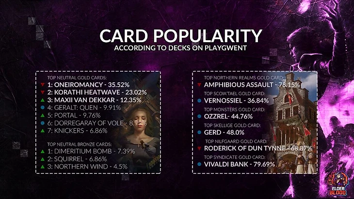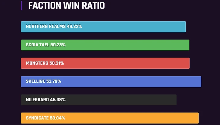 В мете Гвинта также происходят интересные вещи. Синдикат захватил негласное лидерство, что сильно подняло популярность этой непростой фракции в последние месяцы. Нильфгаард, большую часть времени считавшийся топовой фракцией, постепенно оседает на дне и требует серьезной переработки.