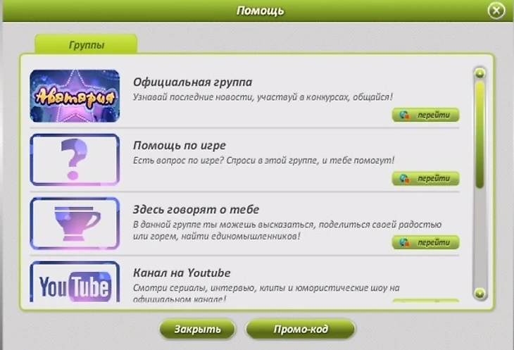 Нажмите на иконку круга со знаком вопроса. Откроется это окно – внизу вы увидите кнопку «Промо-код». Она вам и нужна. Далее нужно просто ввести промокод, список актуальных промокодов для Аватарии – дальше в тексте.