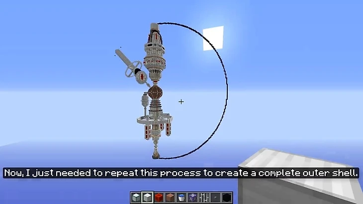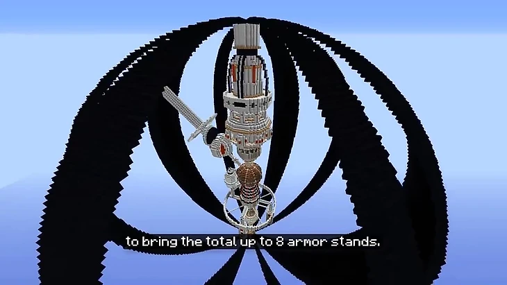 С помощью этого гаджета IJAMinecraft запрограммировал стойку для брони, чтобы она начертила идеально круглые линии оболочки Звезды смерти блоками бетона. Вручную на этот процесс ушли бы недели. Правда, даже с одной стойкой «отливка» шла слишком долго, поэтому их число увеличили до 8: