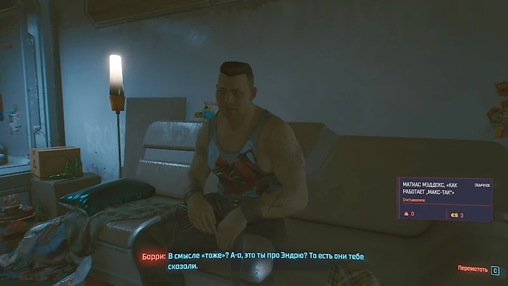 Неподалеку от двери собственной квартиры Ви увидит двух полицейских, Надежду Петрову и Мендеса. Они стучат в дверь к вашему соседу и пытаются узнать, как его дела. Поговорите с ними – они попросят узнать, как дела у их друга Барри, который заперся в своей квартире.