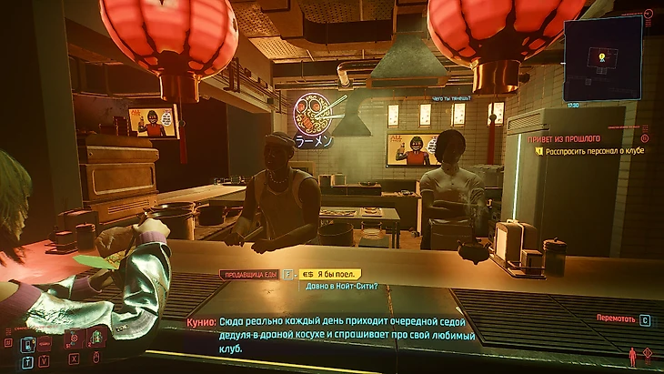 Поговорите с поваром – он расскажет, что теперь тут небольшая кухня, но к ним регулярно заглядывают ностальгирующие деды. Он отправит Ви и Джонни к продавцу-фанату Samurai на рынке.